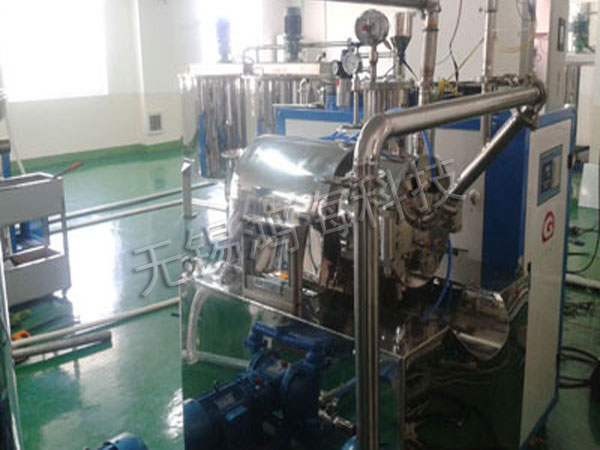 加料泵將預分散的材料送人研磨桶,研磨筒內(nèi)裝有研磨介質,磨細后的物料經(jīng)動態(tài)分離器排出,視產(chǎn)品細度不同,可采用單臺連續(xù)或多臺串聯(lián)連續(xù)研磨工藝。